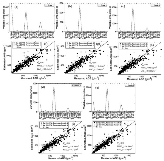 To further demonstrate the necessity of extracting multiscale textures for AGB estimation under multiple growth stages, the LSSVM regression analyses were conducted using the textures at each scale to examine their predictive performance. According to the importance values for the textures at each scale, it could be observed that the texture metric “Mea” still had a higher degree of importance than the other texture metrics. Among the textures from five scales, the textures at scale 1 yielded the best estimation accuracy with R2val = 0.82, RMSEval = 140.95 g/m2, and MAEval = 109.10 g/m2. The textures at scale 2 and scale 3 got the intermediate estimation accuracy. The textures at scale 5 got the worst estimation accuracy and achieved comparable accuracy with the single-scale GLCM-based textures. It could be obviously observed that the LSSVM regression model based on the multiscale textures produced better estimation accuracy than that based on the single-scale textures.