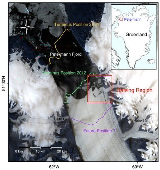 - Münchow, A.; Padman, L.; Fricker, H.A. Interannual changes of the floating ice shelf of Petermann Gletscher, North Greenland, from 2000 to 2012. J. Glaciol. 2014, 60, 489–499. [Google Scholar] [CrossRef]