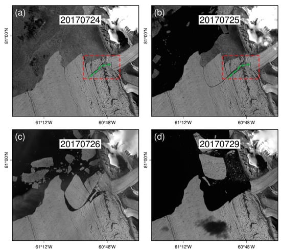 The sequence of Sentinel-2 NIR-band images showing the Petermann Glacier terminus collapse event in 2017. (a) The fracture of the terminus region occurring; (b) the fracture of the terminus region widening; (c) the frontal collapse event that occurred on 26 July 2017; (d) iceberg drift after collapse. The red polygon region shows the shear zone and the green line denotes the bending deformed ice.