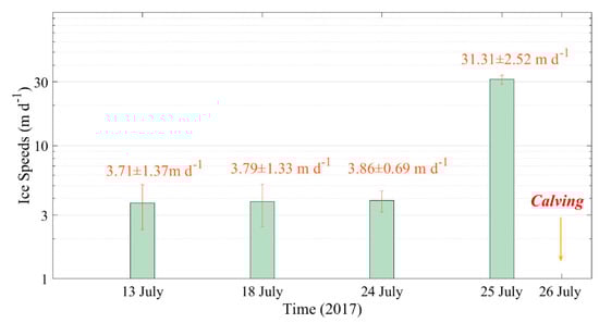 Sentinel 2A/2B images characterized the frontal collapse process near the glacier terminus in PG, as shown in Figure 2. We acquired the high-resolution 20-m ice velocity with a sub-week or even daily overpass timescale in July in 2017. There is a sign of widening of the fracture taking place on the day (25 July 2017), prior to the calving event date (26 July 2017). The contours of the PG terminus position are shown in Figure 3, and we calculated the mean velocity to analyze the trend of the flow rates. Average surface velocities on the calving region show a relatively steady state of 3 m/d, with a huge peak of 31 m/d observed one day before the calving, which corresponds to evident accelerated signal shown in Figure 3d. In the glacier velocity field results, the average displacement of bedrock in an off-glacier region was used as an accuracy measure to assess uncertainty of the ice speeds [21]. The uncertainty of ice velocity for six-days internal was approximately 4.2 m (0.69 m/d), and the measurement error of ice velocity between 24 July and 25 was 2.52 m for the one-day internal, as shown in Figure 4. Additionally, the speed of the upstream region at one-day internal showed less than other dates in Figure 3d due to the measurement error limited by the capacity of feature tracking algorithm extracting small displacement. In general, the accuracy of velocity is reliable to analyze the changes of time series at the terminus calving region within considerable accuracy range.