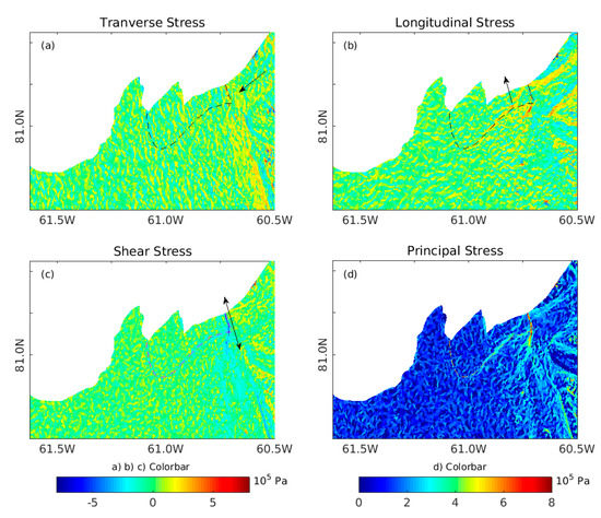 We applied an analytical forward model implemented in the ice sheet system model to calculate the spatial-temporal distribution of damage and stress [48]. The ice flow was approximated using MacAyeal/Morland’s “shelfy stream approximation” (SSA) technique within a 2-D model. The observed velocity and rheology assumed as constant were used to calculate the stress field of floating ice according to Glen’s flow law, which revealed an approximately proportional relationship between glacier strain rate and deviatoric stress [49]. An important consequence of this analytical solution is that the damage and effective deviatoric stress can be calculated analytically as the stress balance evolves to quantify and diagnose the glacier instability state. The axes of the principal stress was computed by using the surface stress to compare with the orientation of the crevasses on glacier terminate position [50]. We can write the expression for effective stress and damage in the simplified form [48,50]: