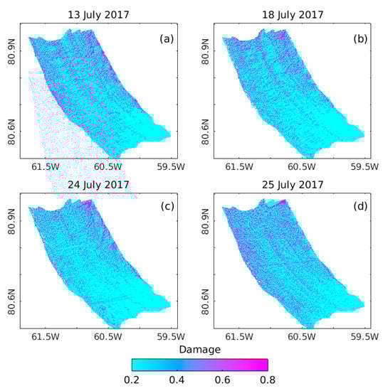 The damage scalar series of the Petermann Glacier on the days in July 2017, prior to the calving. (a–d) respectively represent mean damage scalar from the corresponding periods.