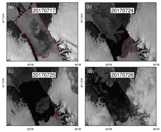 The outline of landfast sea-ice images of Landsat 8 in the Petermann glacier fjord in July of 2017. The red polygon region denotes the extent of landfast sea ice in (a–c). (d) The landfast sea ice has completely disappeared.