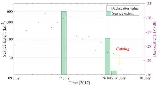 We calibrated the backscatter calculation based on SAR images to quantify the freeze and thaw state, which provided a representative condition estimate [53] and reflected the toughness of the landfast sea ice. Additionally, the sea-ice extent adjoint to ice front has declined dramatically summer ice extent in recent days by delineating the extent of sea ice in fjord. Backscatter value of Sentinel1 GRD data serves as an index for thaw-melt state of sea ice and ice mélange. The landfast sea ice transformed into open water and break up in Figure 8 when the backscatter coefficient decreased to −28 from 17 July to 26 July (calving day) accompanied by sea ice extent declining in Figure 9.