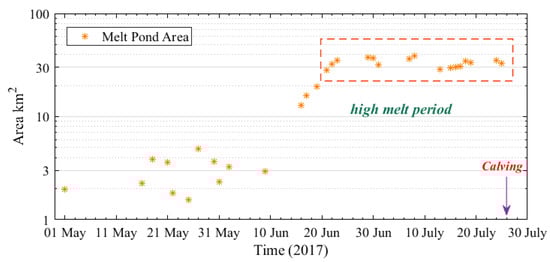 The time series of the Petermann glacier melt ponds’ area in the floating ice region prior to the calving event of July 2017.