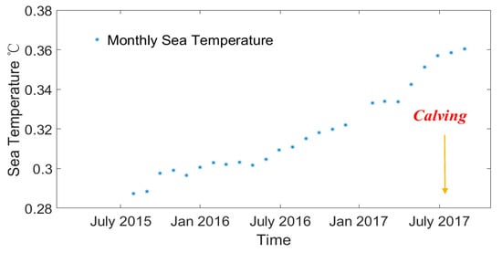 The calving event of PG in 2017 was attributed to the breakup of sea ice at the ice tongue termination. It has been shown that landfast sea ice can protect the ice tongue from fracture and delay calving events. The backscatter serves as an indicator of sea-ice condition to detect the evolution of sea-ice rigidity in Figure 9. The water reflected the low backscatter values due to the high dielectric constant, and with the temperature of the sea warming, ice mélange and sea ice melt volume started to increase. The warming sea water weakened the rigidity of sea ice responding to the decline of the observed backscatter parameter seen in Figure 9. The warming sea water destabilized with a frontal collapse signature on the terminus surrounded by stagnant regions easily visible in satellite images in Figure 8. In particular, the ocean temperature increased by 0.1 °C since 2017 below 450 m on the Petermann floating ice shelf (Figure 11)—the improved basal melt rate thinned the frontal ice shelf [54]. Ocean warming makes landfast sea ice vulnerable, and the reduced buttressing enhances the potential for calving. Quantifying and analyzing sea ice condition will enhance the ability of understanding the mechanism of ice front retreat. The weakening of landfast ice becomes the most proximal cause for the onset of ice disintegration.