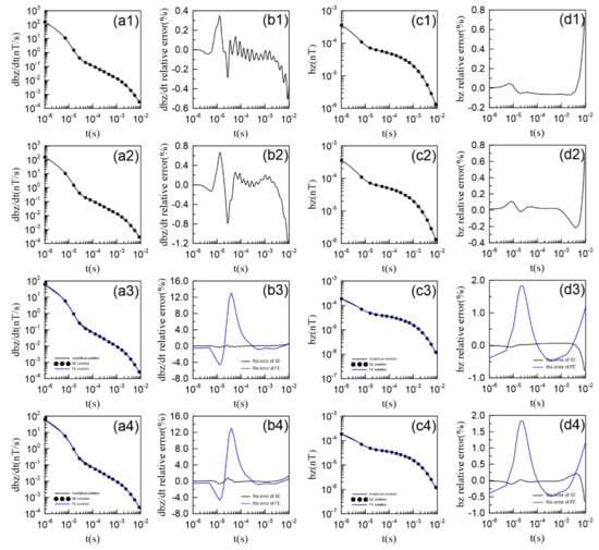 dbz/dt and bz responses and relative errors against the semi-analytical solutions for the 3-layer model in Figure 1. (a1)–(d1) Scheme 1: 40 m × 40 m × 20 m mesh combined with the third order of interpolation basis functions; (a2)–(d2) Scheme 2: 60 m × 60 m × 20 m mesh combined with the fourth order of interpolation basis functions; (a3)–(d3) Comparison of the finite-element solutions based on structured grids with the spectral element solutions via Scheme 1; (a4)–(d4) Comparison of the finite-element solutions with the spectral element solutions via Scheme 2. The central grid size for the finite-element method is 2 m × 2 m × 2 m.