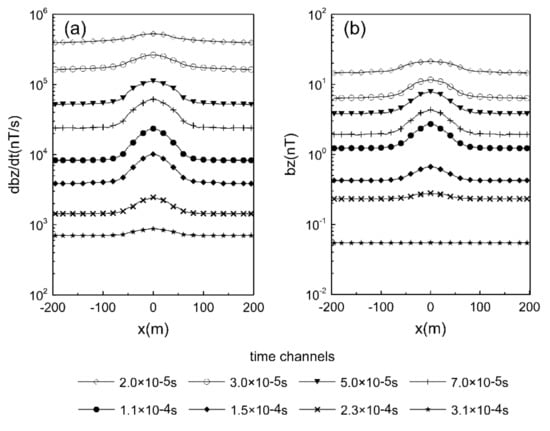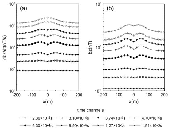 Next, we study the AEM responses for a model with two vertical dykes embedded in a homogeneous half-space (Figure 9). Each dyke has a dimension of 30 m × 120 m × 120 m and is buried at the depth of 30 m. The distance between the two dykes is 40 m. The conductivities of the two dykes are 0.2 S/m, while the background conductivity is 0.002 S/m. We discretize the model domain into the elements of 30 m × 30 m × 30 m and take the fourth order of interpolation basis functions. Figure 10a,b show the dbz/dt and bz responses. It is seen from the figures that the EM responses demonstrate as the superposition of two dykes. At the early time, the EM field shows a weak and broad anomaly, meaning that the two dykes are coupled and not distinguishable. With time passing the anomalies from two dykes become stronger and more distinguishable. Three peaks can be seen clearly, representing the EM field of two dykes. The anomaly in the middle is larger than the neighboring two anomalies as it is the superposed anomaly from the two dykes. Similarly, the centers and the boundaries of the dykes can be distinguished respectively from the minimum anomaly locations and the middle points between the maximum and minimum peaks. This further implies that from the anomalies of a time-domain AEM system, we can distinguish the anomalous bodies in the underground. For the computer environment mentioned in Section 3.1, the time for calculating a decay curve of 1000 time channels at a single survey station takes about 43.7 min.