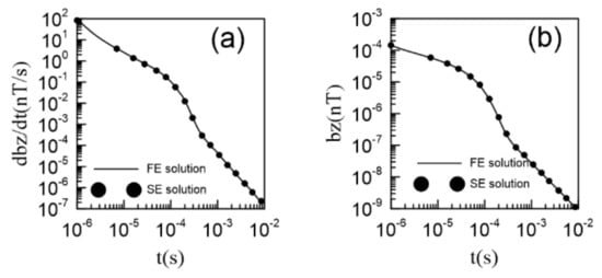 Comparison of (a) dbz/dt and (b) bz responses calculated by our SETD method with those calculated by FE method based on unstructured grids for the horizontal plate model in Figure 4.