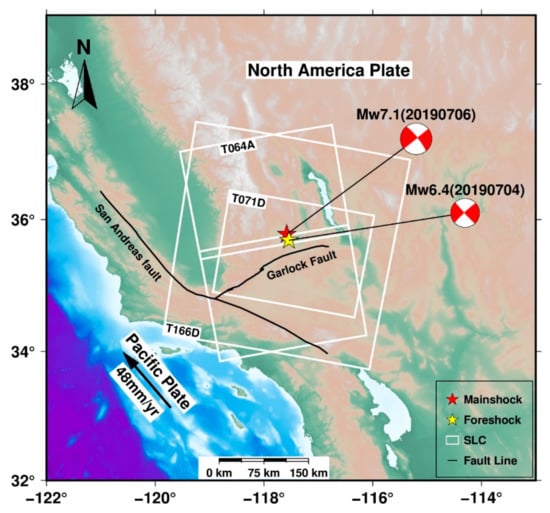 In recent years, with the increase of SAR satellite and the development of SAR technology, InSAR technology has been widely used in co-seismic deformation and fault mechanism interpretation [5,6,7], such as the Ms 7.4 earthquake in Tajikistan in 2015 [8] and the Mw 6.1 Ludian earthquake in 2014 [9], etc. Various scholars have also provided focal mechanism solutions for the 2019 California earthquakes, as displayed in Table 1. Although they obtained the co-seismic deformation and inversed the slip distribution, their results were inconsistent. In addition, there have been few studies on post-earthquake deformation.