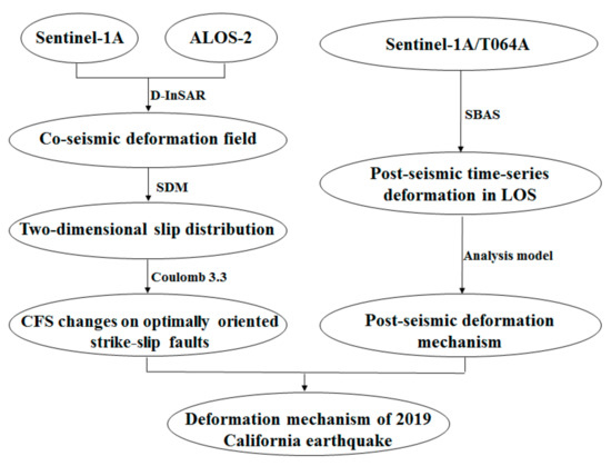 On 4 July 2019, and 6 July 2019, a series of earthquakes occurred successively in California, United States, including a magnitude (Mw) 6.4 (foreshock), Mw 7.1 (mainshock), and many aftershocks. Until 16 August 2019, over 26,000 aftershocks occurred. The epicenter was located at the intersection of many of the secondary faults, and this earthquake was a new fault rupture event, which is significant in helping us further understand the geological structure of Southern California. After the earthquake, many researchers began to use interferometric synthetic aperture radar (InSAR) technology to study the co-seismic deformation field and Coulomb failure stress (CFS) in the area. Li et al. (2019) obtained the co-seismic deformation field using Sentinel-1A, Advanced Land Observing Satellite-2 (ALOS-2), and Global Positioning System (GPS) data, inverted the source parameters of the mainshock and foreshock, and calculated the Coulomb stress changes caused by the two earthquakes [1]. Chen et al. obtained a foreshock and mainshock asperity model using Sentinel-2 images, GPS, and seismic waveform datasets [2]. Barnhart et al. acquired co-seismic deformation fields from the ascending and descending of Sentinel-1A, and they calculated the optimal slip model and Coulomb stress for both the mainshock and foreshock [3]. Liu et al. selected strong-motion recordings from GPS stations near the epicenter. They conducted a series of preliminary finite fault inversions to explore the fault geometry and slip distribution constraints. Finally, they inversed the source rupture process using seismic waveform datasets [4].