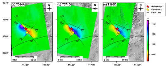 - Milliner, C.; Donnellan, A. Using Daily Observations from Planet Labs Satellite Imagery to Separate the Surface Deformation between the 4 July Mw 6.4 Foreshock and 5 July Mw 7.1 Mainshock during the 2019 Ridgecrest Earthquake Sequence. Seismol. Res. Lett. 2020, 91, 1986–1997. [Google Scholar] [CrossRef]