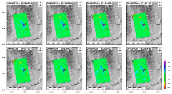 We obtained the time-series deformation along the LOS from 28 July 2019, to 15 August 2020. Figure 4 displays a portion of the post-seismic deformation field. Conjoint analysis of co- and post-seismic deformation field demonstrated that the post-seismic deformation was smaller than the co-seismic deformation and that the post-seismic deformation primarily occurred near the epicenter. The movement direction of the post-seismic deformation was the same as that of the mainshock. Therefore, it was preliminarily determined that the post-seismic deformation mechanism was predominately after-slip.