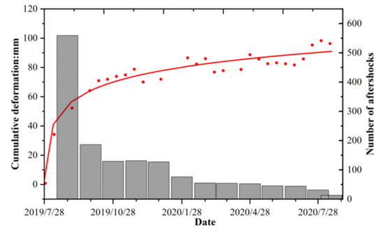 where D is the initial main shock deformation (mm), a is the amplitude of the log function, t is the time interval after the mainshock (d), and y is the cumulative deformation (mm). The post-seismic deformation was set as the initial D value in Equation (3); D was set to 3.179, and a was set to 33.96. The fitting curve is illustrated by the red line in Figure 5.