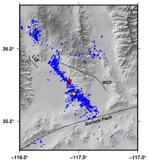 - Felzer, K.R.; Becker, T.W.; Abercrombie, R.E.; Ekström, G.; Rice, J.R. Triggering of the 1999 Mw7.1 Hector Mine earthquake by aftershocks of the 1992 Mw7.3 Landers earthquake. J. Geophys. Res. 2002, 107, 6–13. [Google Scholar]