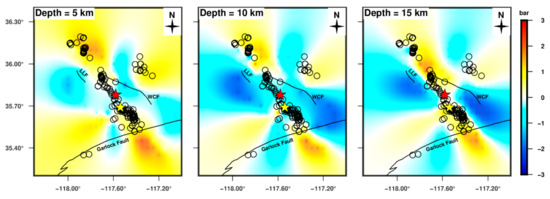 Based on the co-seismic slip distribution results, the fault rupture influence on the surrounding area was calculated using Coulomb3.3 software [36,37]. The relationship between the CFS and aftershock distribution was analyzed. We set the shear modulus to 30 GPa, the effective friction coefficient to 0.4. We selected the optimal strike-slip fault as the receiving fault. Using the co-seismic slip distribution results, we calculated the Coulomb stress changes at various projection depths. The Coulomb stress changes at depths of 5, 10, and 15 km are displayed in Figure 10. The released co-seismic moment was 4.3 × 1026, which is equivalent to Mw 7.06. According to a previous study [37], we know that the Coulomb stress field of a strike-slip earthquake is petal-shaped, which is consistent with our calculation results (Figure 10). If the Coulomb stress is greater than 0.1 bar, it can trigger subsequent aftershocks. Based on the calculation results, we found that the positive stress area was distributed along F1 and F2, and the stress shadow areas were roughly distributed in the NW–W, SE–E, and N–NW region. The maximum Coulomb stress was 3 bar and was located near F1. We found that aftershocks of Mw >3.0 were primarily distributed in the positive Coulomb stress area (Figure 10). However, certain aftershocks were located in negative Coulomb stress areas, such as the aftershocks on the WCF. This phenomenon demonstrated that the failure process of this earthquake was complex, and one stress triggering mechanism cannot fully explain the process. The aftershocks were distributed within the stress shadow area, which was related to many factors, such as fault failure geometry, dynamic stress triggering mechanism, and regional tectonic environment [38,39].