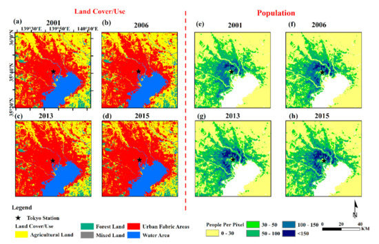 - Population variable—Population or population density indirectly affects the urban thermal field. Along with the vast production of anthropogenic heat, the concentration and overcrowding of the population impose serious pressure and demands on urban settlements and infrastructure constructions. This is why we incorporated the population as one of the essential determinants of SUHI formation. In this study, we used spatial demographic data at a high resolution of 100 m provided by the WorldPop Project, University of Southampton, UK (https://www.worldpop.org/) [79], to map the population distribution in TMA in 2001, 2006, 2013, and 2015. Numerous studies have gained valuable findings using this population data archive [80,81];