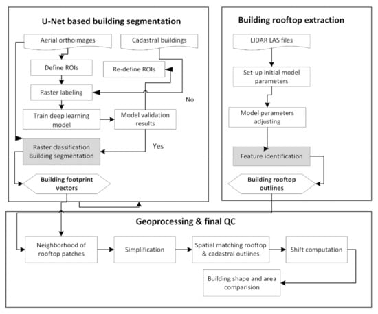 In a few years, the modernized cadastre covered almost the entire country’s territory. As documented by the Head Office of Geodesy and Cartography at the end of 2017, building outlines were still recorded in an analogue (paper) form in 3% of urban and 14% rural areas, and respectively 1% and 6% in the raster (scanned analogue map) supplemented by buildings’ centroids []. Moreover, § 63.1. of the latest update of the land and buildings register regulation [] allowed for the registration of building outlines in the form of a point representing the building center. The regulation also requires cadastral authorities to periodically verify the land and building register (§ 44), as well as to eliminate existing inconsistencies by updating or modernizing cadastral data. It should be noted, however, that the modernization of the cadastre has been defined by law [] as a set of technical, organizational and administrative activities undertaken to adapt the existing cadastral data to the requirements of a modern, up-to-date and fit-for-purpose IT system. Hence, the motivation of this study is a thorough analysis of the possibilities and limitations of verification and modernization of the Polish cadastre by remotely extracted buildings from high-resolution aerial orthoimages and LiDAR data. We proposed a three-stage end-to-end methodology of building rooftop outlines extraction. An inseparable part of the method constituted the geo-processing of vectors of buildings’ rooftop surfaces, derived from deep learning orthoimage segmentation and LiDAR data processing. Therefore, the research makes both a scientific and a practical contribution. The main goal of this study is to automate the extraction of building rooftop outlines based on the deep learning algorithm enriched with the LiDAR segmentation and geoprocessing to map the rooftop outline of buildings. The deep learning algorithm is based on a modified U-Shape Network (U-Net) so it provides precise buildings segmentation with a relatively small number of training images. In the proposed U-Net architecture, the size of the feature map was empirically set-up as 416 × 416 × 1. The analysis is supported by publicly available data (orthoimagery and LiDAR densely classified data (DSM)) from the official geoportal of the Head Office of Geodesy and Cartography, the National Mapping Agency in Poland.