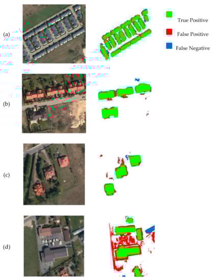Figure 8a portrayals a group of multi-family houses. The building’s roofs were dark grey, clearly separated from the light grayish color of the interior roads and the greenish-brown grassy surroundings as well as a few whitish cars. However, the close location of the buildings inside the estate, in rows of three, led to their extraction as one elongated building. Figure 8b shows single-family attached buildings, characterized by hipped reddish and grayish roofs, partly shadowed by trees. The ENVINet5 algorithm correctly extracted all buildings; nevertheless, the touching buildings, i.e., buildings with adjacent roofs and walls, were identified as one feature. The next example (Figure 8c) demonstrates correctly extracted single-family buildings, despite some disturbance caused by vegetation and other objects located on the land parcel. The algorithm, however, had a problem with the correct building extraction in an area characterized by a less dynamic color scheme (dark greyish) between the roofs and the parking lot and nearby streets. It was indicated as false positive, over-classified (indicated in red—Figure 8d). Another error that was observed in this area was the identification of cars as buildings.