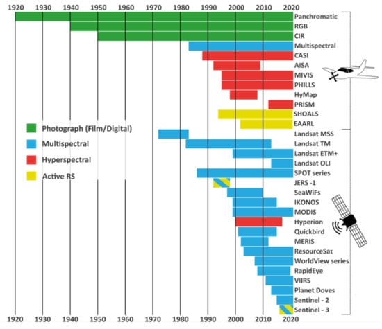 Innovations in aerospace technologies have allowed the evolution of manned aircraft-mounted (hereafter called “airborne”) sensors and satellite platforms; each increasing the spatial scale of the RS data available to users. Satellite RS has largely dominated the discipline, as can be seen through the substantial volume of work exploiting this data source and the large selection of active sensors shown in Figure 1 [26]. Technological advances, though, particularly in terms of unmanned aerial vehicles (UAV), are continuously providing new opportunities. The recent commercialization of UAVs and innovations leading to their increased affordability have made UAVs an appealing option for small-scale studies [24,27,28].