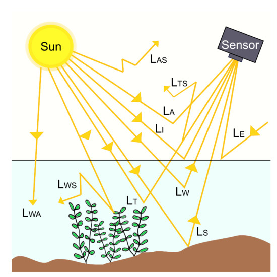 A simplified illustration of the interactions of light as they originate from the sun and are recorded by an optical sensor. The labels are as follows: LT = Radiance reflected by the target; LTS = Radiance reflected by the target then scattered out of the path to the sensor; LS = Radiance reflected by the non-target substrate; LA = Radiance reflected by the atmosphere to the sensor (also referred to as path radiance); LAS = Radiance scattered by the atmosphere; LW = Radiance reflected by the water column into the sensor; LWS = Radiance scattered by the water column; LWA = Radiance absorbed by the water column; LI = Radiance reflected by the air-water interface; LE = Radiance that is scattered into the scene by the ambient environment.