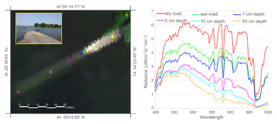 The attenuative effect of the water column on the recorded signals of a flooded cement road at the Long Sault Parkway, ON, from airborne hyperspectral imagery (HSI) (CASI-1500). The colored boxes identify the pixels for which the spectra are shown on the right in units of radiance. The pixels chosen represent an increasing effect of the water column, with the dry road pixel being entirely unaffected by water. The inset photo shows what the flooded road looks like from the ground and was taken at the point indicated by the yellow circle. Note that the spectra here are in radiance, prior to atmospheric correction, as such the strong atmospheric water absorption features (e.g., 940 nm) can be seen in the spectrum from the dry road.