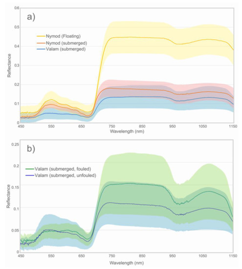 Examples of vegetation spectra, with one standard deviation from the mean shown as shading; (a) A comparison of the effect of a thin layer of water (<5 mm) on the measured reflectance of a single species and the difference in profile shape between species. Note the prominent green peak in the spectrum of Nymod near 550 nm and the red-edge around 680 nm. The measured spectra of the submerged plants are lower across the spectrum, especially so in the NIR region. Valam does not display as prominent a green peak due to its higher relative concentration of accessory pigments making the leaves appear reddish-brown. (b) A comparison of the effect of epibiont and sediment fouling on the same plant sample. The profile of the fouled plant has a different shape and less spectral variability in the visible region than that of the unfouled plant. Nymod = Nymphaea odorata; Valam = Vallisnaria americana.