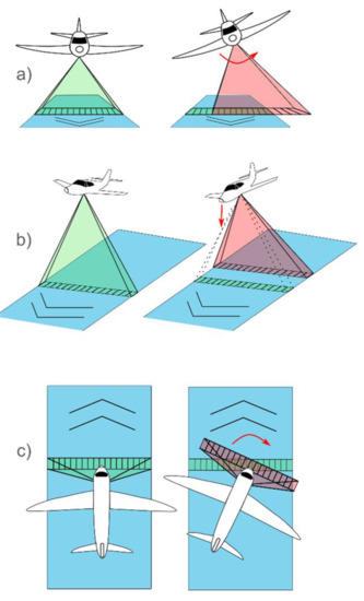 The effect of platform attitude on the look direction of a sensor. (a) A “rolled” aircraft will cause a sensor to image an area adjacent to the intended flight line. (b) A change in platform pitch will cause the sensor to image a portion of the flight line that is not directly below it; rapid changes in pitch may therefore cause duplicate imaging of some targets (downward pitch aiming the sensor backward) or gaps (upward pitch aiming the sensor ahead). (c) A change in yaw will angle the view of the sensor so consecutive rows of pixels are not parallel, resulting in gaps and duplication.