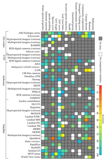 An illustration of the extent and accuracy of previous aquatic RS work regarding SAV. The maximum accuracy found (reported as percent overall accuracy or R2) is depicted for each sensor-application pairing. Colored squares are on a gradient scale from 0 to 100, representing either percent overall accuracy or R2 × 100. White squares indicate that the sensor-application pair was encountered but no suitable overall accuracy measure was provided. Grey squares indicate that no source employed that sensor-application pairing. The large number of white and grey squares respectively demonstrate the need for consistent accuracy reporting and the huge research gaps to date in aquatic RS. Active sensors are italicized. All sources cited in this text were reviewed in the compilation of the figure, as well as references [140,141,142,143,144,145,146,147,148,149,150,151,152,153,154,155,156,157,158,159,160,161,162,163,164,165,166,167,168,169,170,171,172,173,174,175,176,177,178,179,180,181,182,183,184,185,186,187,188,189,190,191,192,193,194,195,196,197,198,199,200,201,202,203,204,205,206,207,208,209,210,211,212,213,214,215,216,217,218,219,220,221,222,223,224,225,226,227,228,229,230,231,232,233,234,235,236,237,238,239,240,241,242,243,244,245,246,247,248,249,250,251,252,253,254,255,256,257].