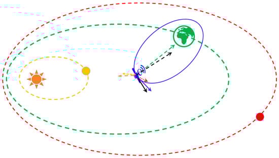 In Figure 1, the orange circle and triangle denote the Sun, the yellow circle denotes Venus, and the dotted yellow line is its orbit around the Sun. The red circle denotes Mars, and its orbit is illustrated by a dotted red line. Earth is denoted by a green circle, and the dotted green line denotes its orbit around the Sun. The blue line denotes the designed orbit for satellites around the Earth, and the blue object is a satellite. Other planets (Mercury, Jupiter, Saturn, Uranus, Neptune, and Moon) are not shown in Figure 1. The effect of instantaneous gravity from planets on satellites is denoted by arrows. The dotted orange arrow denotes the joint forces of gravity and solar pressure from the Sun. The dotted yellow, red, and green arrows denote the gravity from Venus, Mars, and Earth, respectively. Supposing the force affecting satellites is only from the Earth and the density of the Earth is uniform, satellites could run perennially around the Earth in their designed orbits; the blue arrow denotes the velocity of satellites. In fact, there are various forces acting on satellites from the gravity of multiple planets, solar pressure, and nonspherical gravity from the Earth. Thus, the actual instantaneous joint forces acting on satellites are different with the gravity from the Earth, which is denoted by the dotted black arrow, and the actual instantaneous velocity is expressed by the solid black arrow. Satellite orbits are continuously changed due to perturbations from multiple planets and other factors, as shown in Figure 2.