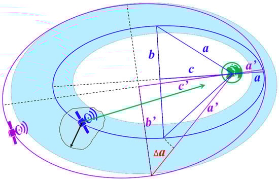 In Figure 2, the green circle denotes the Earth, which is the focal point of satellite orbits. The initial orbit of satellites is shown the elliptical blue curve, line a is the orbital semimajor axis, line b is the orbital semiminor axis, and line c is the half focal length of the satellite orbit. The light blue part denotes the normal range of satellite orbits. When satellites deviate from the normal orbit range, they can be adjusted by orbit maneuvering, using their propulsion system. The green arrow denotes the instantaneous gravity force acting on satellites from the Earth. The black arrow denotes the instantaneous joint forces from multiple planets acting on satellites, which leads to satellites tending to gradually deviate from their normal orbital range. The shape of the satellite orbits also changes with time. This can be shown by the pure curve, which denotes the satellite orbit that needs to be adjusted though orbit maneuvering; line a is the orbital semimajor axis, line b is the orbital semiminor axis, and line c is the half focal length of the satellite orbit. The variation in the orbital semimajor axis Δ a is the difference value of the norm of a and a , which is indicated by the dotted red line in Figure 2. Satellites periodically traverse the sky around the center of the Earth, which allows the perturbations from multiple planets to yield periodicity. The comprehensive perturbations from planets on satellites can be counteracted on short-term time scales [24]. The short-term periodical variation of the semimajor axis is not discussed for orbit maneuver prediction in this study. The comprehensive perturbations also cause long-term satellite drift, which leads to variation of the orbital semimajor axis. The orbital semimajor axis a can be expressed as follows: