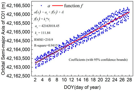 For variation characteristics of the orbital semimajor axis, we analyzed the experimental results for BeiDou C01. The orbital semimajor axis from the broadcast ephemeris was selected to estimate the coefficients of the functions, and data from 2–27 January 2015 were selected for the fit; the results are shown in Figure 3.