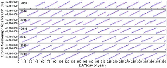 Figure 4. Time series values of orbital semimajor axis for C01 from 11 February 2013 to 12 December 2019.