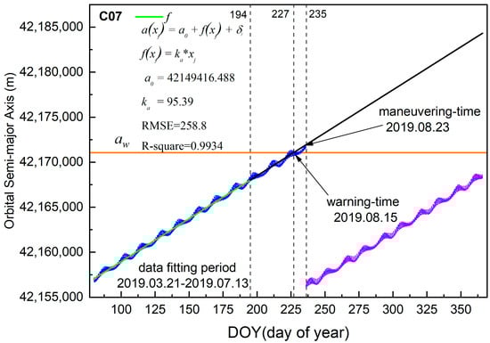 In Figure 5, the x-axis is the day of the year and the y-axis is the value of the orbital semimajor axis. The teal and black lines indicate the graph of the function. The function was fitted using data from 21 March to 13 July 2019; a 0 is 42,149,416.488 m and k a is 95.39 m/day. In addition, the measured orbital semimajor axis also includes short-term periodical variation due to the short-term comprehensive influence from multiple planets, random error, and orbital semimajor axis calculation error, which is reflected in δ j , and the root mean square error (RMSE) is 258.8 m. The coefficient of determination (R-square) is 0.9934. The value of a w is 42,171,060 m and the warning time of the maneuvers t w can be calculated as 15 August 2019 by Equation (4) The blue and purple points denote the measured orbital semimajor axis before and after orbit maneuvering, respectively. The C07 satellite was adjusted through orbit maneuvering on 23 August 2019. The orbit maneuvering mechanism is unknown, and the measured orbital semimajor axis contains the short-term comprehensive influence from multiple planets, random error, and orbital semimajor axis calculation error, which brings difficulties in accurately calculating the warning time of the maneuvers. Therefore, orbit maneuver prediction factors were analyzed, and the results are shown in Figure 6.