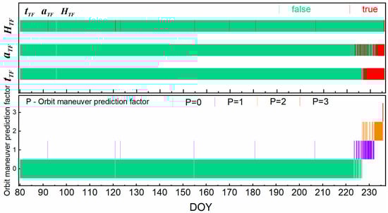 In Figure 6, the x-axis is the day of the year, and the top half is the results of warning flags of orbital semimajor axis and SV health and the warning time flag for orbit maneuvering. The green vertical bar indicates that the corresponding value is false, and red vertical bars indicate true values. The first line denotes the warning flag of SV health; C07 was sometimes marked unhealthy in this period. Satellites marked as unhealthy are not necessarily adjusted by orbit maneuvering, which needs the measured orbital semimajor axis and the warning time for orbit maneuvers to calculate the orbit maneuver prediction factors. The results of orbit maneuver prediction factors are shown in the bottom half, and a partial detail of Figure 6 is shown in Figure 7.