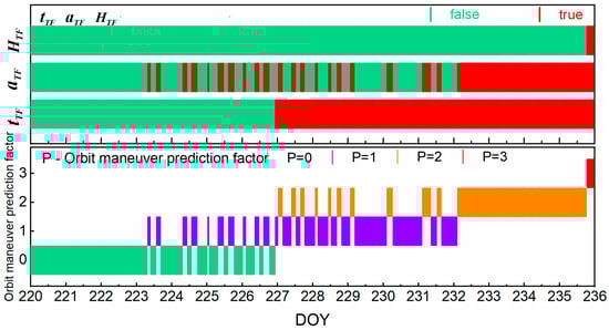where P a is the prediction factor of the orbital semimajor axis at epoch i ; a i is the orbital semimajor axis value of epoch i ; a w is the warning value of the orbital semimajor axis; a T F is the warning flag of the orbital semimajor axis, which is true when the value of a i is greater than a w , otherwise a T F is false. The orbit maneuver prediction factor of the satellite health identifier is defined as follows: