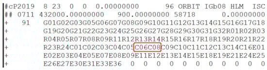 The value of the orbit maneuver prediction factor P is determined by the above flags, which is shown in the bottom part. The green vertical bars show that the value of the orbit maneuver prediction factor is 0, indicating that the satellite is healthy. The purple vertical bars show that the value of the orbit maneuver prediction factor is 1, indicating that there are some abnormalities of the satellites, and this case is defined as attention level. The alert level is defined when the value of the orbit maneuver prediction factor is 2, which is denoted by vertical orange bars, indicating that the satellite was recently adjusted by orbit maneuvering. The vertical red bars show that the value of the orbit maneuver prediction factor is 3 and the alarm level for maneuvers, which indicates the satellite would be maneuvered 1–2 h later. The orbit maneuver prediction factor of C07 satellite changed to 3 at 16:00:00 on 23 August 2019. This indicates that the satellite would be maneuvered between 19:00:00 and 21:00:00 on 23 August. In order to demonstrate that the C07 satellite was maneuvered on 23 August 2019, the final precise orbit products from iGMAS were chosen. The final precise orbit cannot be estimated because of maneuvered thrust. The header of the precise orbit products published by iGMAS and Wuhan University (WHU) was shown in Figure 8.