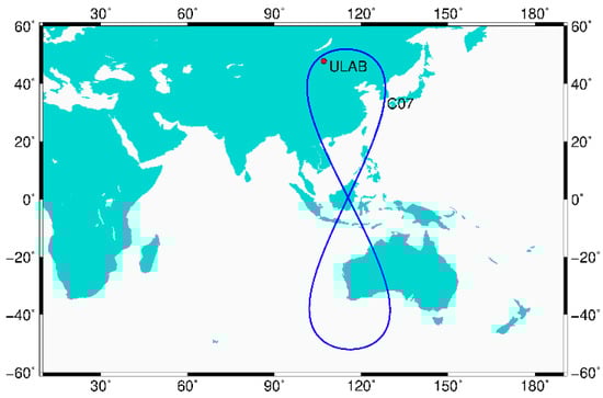 In Scheme 1, the real-time position used the ultra-rapid precise products of 18:00 on 23 August 2019 published by GFZ. The GFZ ultra-rapid precise products were also chosen for Scheme 2, which removed the maneuvered C07 satellite in advance according to the prediction information. The carried phase and code measurements of single BDS from station ULAB, which is located at Ulaanbaatar, Mongolia, were collected for positioning. The C07 satellite was adjusted through orbit maneuvering between 19:00:00 and 21:00:00 on 23 August, which had to be observed by station ULAB. The station distribution and the ground track of the C07 satellite are shown in Figure 9.
