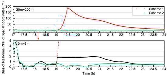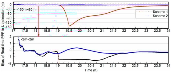 In Figure 13, the x-axis is the epoch time and the y-axis is the value of the bias of real-time PPP in the up direction. The crimson points denote the real-time PPP bias after the first estimation of Scheme 1, the black points denote the real-time PPP bias after iterative estimation of Scheme 1, and the dark blue points denote the bias of Scheme 2. The bottom part is a detail of the top part. The biases of Schemes 1 and 2 are on the same order of magnitude before orbit maneuvering for the C07 satellite, which was less than 1 m after ambiguity resolution. The biases of both schemes changed differently after orbit maneuvering; the up bias of Scheme 1 increased from 19:00:00 to 19:31:30, when the bias of the first estimation reached the highest point of 142.60 m, then it decreased because the weight of C07 was reduced with the elevation angle. After iterative adjustments, the bias of Scheme 1 was less than 1.6 m. A comparison of the positioning biases between Schemes 1 and 2 is shown in Figure 14.