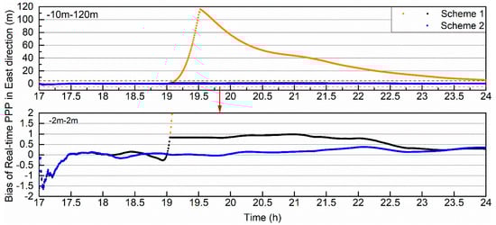 In Figure 11, the x-axis is the epoch time and the y-axis is the value of the bias of real-time PPP in the east. The orange points denote the real-time PPP bias after the first estimation of Scheme 1, which shows the error of the ultra-rapid precise products including the maneuvered satellite. The black points denote the real-time PPP bias after iterative estimation of Scheme 1, which indicates the real-time positioning accuracy of PPP by using the ultra-rapid precise orbit and clock products including the maneuvered satellite, and the blue points denote the bias of Scheme 2. The bottom part is a detail of the top part. The biases of Schemes 1 and 2 are on the same order of magnitude before orbit maneuvering for the C07 satellite, which is less than 0.3 m after ambiguity resolution. The biases of both schemes changed differently after orbit maneuvering; the east bias of Scheme 1 increased from 19:00:00 to 19:31:30, when the bias of the first estimation reached the highest point of 116.26 m, then it decreased because the weight of C07 was reduced with the elevation angle. After iterative adjustments, the bias of Scheme 1 was less than 1 m. A comparison of the positioning biases between Schemes 1 and 2 is shown in Figure 14.