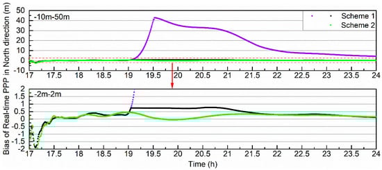 In Figure 12, the x-axis is the epoch time and the y-axis is the value of the bias of real-time PPP in the north. The purple points denote the real-time PPP bias after the first estimation of Scheme 1, the black points denote the real-time PPP bias after iterative estimation of Scheme 1, and the teal points denote the bias of Scheme 2. The bottom part is a detail of the top part. The biases of Schemes 1 and 2 are on the same order of magnitude before orbit maneuvering for the C07 satellite, which is less than 0.3 m after ambiguity resolution. The biases of both schemes changed differently after orbit maneuvering; the north-direction bias of Scheme 1 increased from 19:00:00 to 19:31:30, when the bias of the first estimation reached the highest point of 42.86 m, then it decreased because the weight of C07 was reduced with the elevation angle. After iterative adjustments, the bias of Scheme 1 was less than 0.8 m. A comparison of the positioning biases between Schemes 1 and 2 is shown in Figure 14.