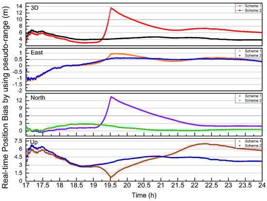 In order to demonstrate the performance of ultra-rapid products containing maneuvered satellites, the real-time position results were analyzed, and are shown in this section. The ultra-rapid precise orbit products published by MGEX and iGMAS include the unusable orbits of maneuvered satellites because the time information of orbit maneuvers cannot be acquired in advance. There are two schemes for real-time position. The differences between Scheme 1 and Scheme 2 were shown in Table 1.