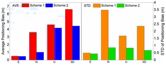 In Figure 15, the x-axis is the epoch time and the y-axis is the value of real-time positioning bias by using the ionosphere-free code observations, which includes the results in space and in the east, north, and up directions. The red points denote the spatial positioning biases of Scheme 1 and the black points denote the results of Scheme 2. The biases of both schemes decreased modestly before 7:00:00, and the bias of Scheme 1 is less than Scheme 2 due to more redundant observations. The biases of both schemes changed differently after orbit maneuvering; the spatial positioning bias of Scheme 1 increased from 19:00:00 to 19:31:30, when it reached the highest point of 13.54 m, then it decreased because the weight of C07 was reduced with the elevation angle. The orange points denote the east positioning biases of Scheme 1 and the blue points denote the results of Scheme 2. The results show that there were no more differences between the two schemes, because the positional correlation of the orbit maneuvering direction and the station position were randomized. The purple points denote the north direction positioning biases of Scheme 1 and the teal points denote the results of Scheme 2. The spatial positioning biases of Scheme 1 were less than Scheme 2 before 7:15:30 due to more redundant observations. The biases of both schemes changed differently after orbit maneuvering; the spatial positioning bias of Scheme 1 increased from 19:00:00 to 19:31:30, when it reached the highest point of 13.49 m, then it decreased because the weight of C07 was reduced with the elevation angle. The crimson points denote the up direction biases of Scheme 1 and the dark blue points denote the results of Scheme 2. The biases of both schemes changed differently after orbit maneuvering; the spatial positioning bias of Scheme 1 decreased before 19:31:30, when it reached the lowest point of 0.72 m. As the positional correlation of the orbit maneuvering direction and the station position were randomized, the positioning bias in the up direction of Scheme 1 was less than Scheme 2 for station ULAB from 19:00:00 to 21:00:00 on 23 August 2019. The average value and standard deviation (STD) of positioning biases from 18:00:00 to 23:59:30 on 23 August 2019 are shown in Figure 16.