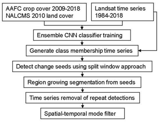 The main processing steps followed in this study are shown in Figure 1. This involved: (1) compositing Landsat time series for spring, summer, and fall periods from 1984 to 2018, (2) training a deep-learning classifier using the AAFC and North America Land Change Monitoring System (NALCMS) cover data, (3) applying the classifier to generate class membership time series, (4) detecting change seed points from the time series using a split window method and a set of membership tests, (5) segmenting changes using region growing from the detected seed points, and (6) removing repeat detections using a temporal cleanup procedure followed by application of a spatial–temporal mode filter. Assessment of the classification and change results was undertaken to identify the limitations and potential improvements for large extent applications.