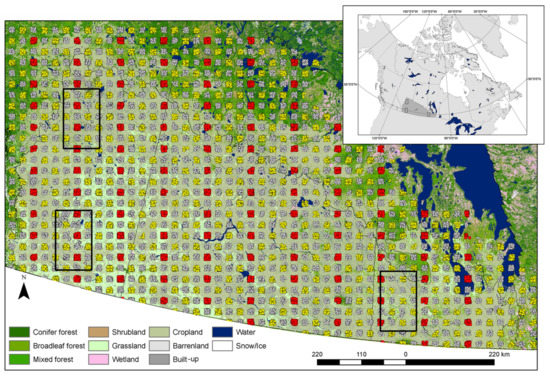 - Latifovic, R.; Homer, C.; Ressl, R.; Pouliot, D.; Hossain, S.N.; Colditz, R.R.; Olthof, I.; Giri, C.P.; Victoria, A. North American Land-Change Monitoring System. In Remote Sensing of Land Use and Land Cover: Principles and Applications; Giri, C.P., Ed.; CRC Press: Boca Raton, FL, USA; Taylor & Francis: Boca Raton, FL, USA, 2016; pp. 303–323. ISBN 9781420070750. [Google Scholar]