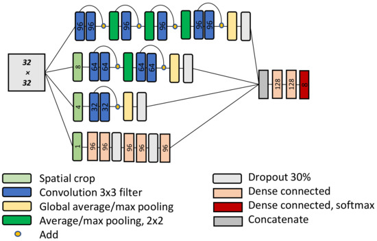 For the deep-learning method, we used a convolution neural network (CNN) incorporating multiple image extents to account for the sensitivity of CNNs to object size/scale [42,43,44]. It is based on the structure used in [45] and shown in Figure 3. The input features were the spring, summer, fall, and elevation data for an image chip of 32 by 32 pixels. For the CNN this image was cropped to sizes of 1 × 1, 4 × 4, and 8 × 8 in addition to the input of 32 × 32. We did not include the 16 × 16 size to reduce the overall size of the network. For each size, we developed a separate network path following a simple ResNet configuration, except for the 1 × 1 which used dense layers instead of convolution layers and no residual connections. Residual connections in CNNs were introduced by He et al. [46]. Residual connections force the next layer in the network to learn something different from the previous layers and have been shown to alleviate the problem of deep-learning models not improving performance with depth. Global average or max pooling was applied at the end of each path and dropout layers were added in an attempt to improve generalization. The outputs from each path were concatenated and fed into a set of final dense layers for class prediction. All activations were Gaussian Error Linear Units (GELU), which have shown good performance in object-recognition tasks among others [47]. Batch normalization was applied after all convolution or dense layers, except for the final output. As for ResNets, l2 weight regularization was used with a factor of 0.0001. For the final output layer after concatenation an eight-node dense layer with softmax activation was applied.