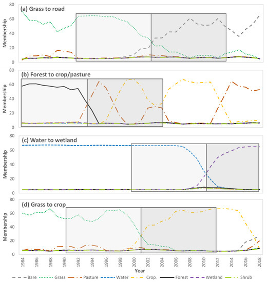 Class specific tests or thresholds can be defined to improve the results regarding the membership change and temporal class persistence. The size of the split window can also be varied to capture changes occurring over different temporal scales. For example, conversions between water and other cover types can occur annually and can be detected using smaller temporal windows, whereas conversion to forest needs to be considered over a longer period. This temporal membership analyses approach provides flexibility in defining criteria to capture change which is an advantage, but also adds complexity.