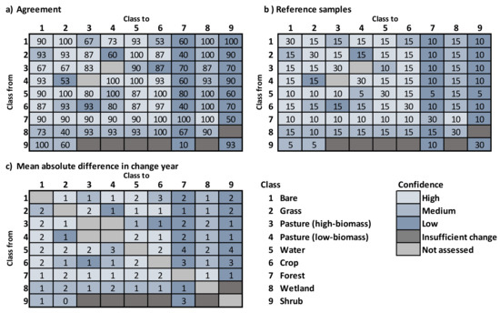 Assessment of the change results are shown in Figure 5 as matrices of from–to change classes providing the estimated agreement with reference samples, the number of samples used to evaluate each change class, and the error in the change year. These are combined across all sample regions and noteworthy differences between regions are discussed below. Examples for visual evaluation are provided in Figure 6. These reveal the delineation accuracy of the change objects and help provide confidence with the derived results.