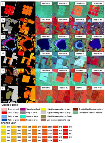 Example change detection results; (a) grass to crop and road, (b) crop to urban, (c) water-body shrinkage, (d) forest to crop, (e) crop to pasture, and (f) pasture to forest. The order from left to right is the result for the change class and year followed by example Landsat images displayed as the near-infrared, short-wave infrared, and red band combination.