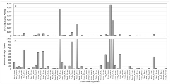 The percent change relative to the total area of the study sites is shown in Figure 7. Values were multiplied by 1000 to better represent small changes, where 10,000 equals 10%. Two graphs with different y-axis ranges are provided for visualization of less frequent changes. Considering the challenge of describing the results for all change classes, we elected to summarize these for natural covers of loss and gain for grassland, forest, water/wetland combined, and also highlight some of the other significant notable changes observed.